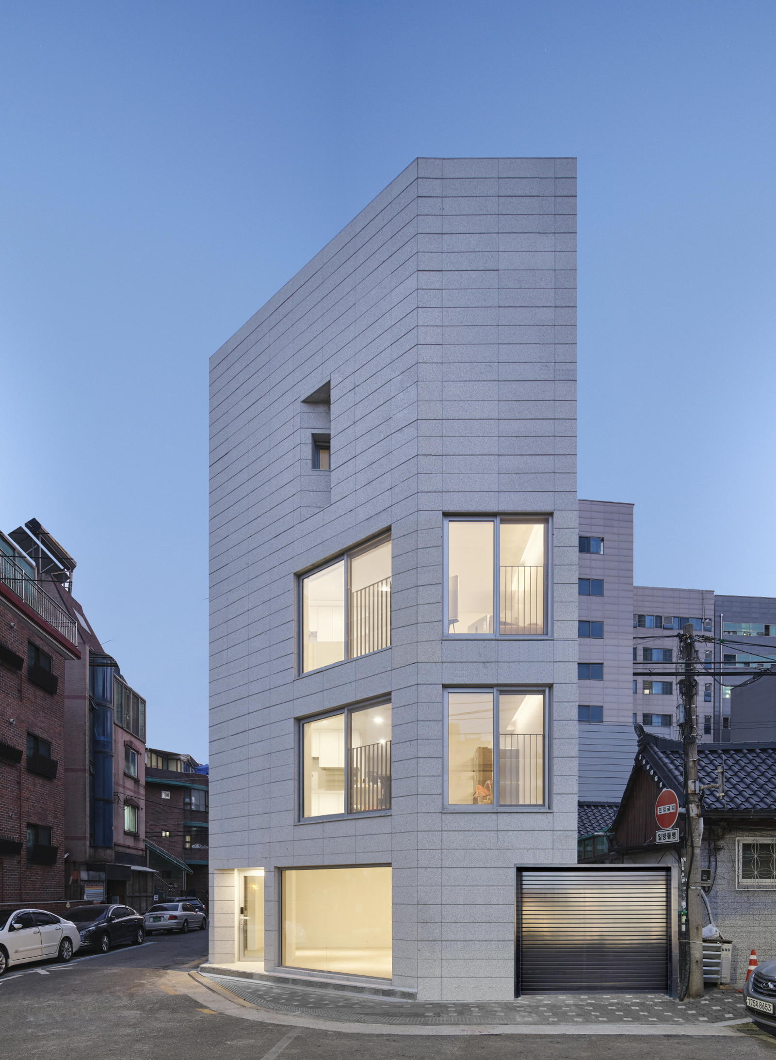 건축 구성은 지상 1층부터 4층까지로, 연면적 약 60평입니다. 1층은 근린생활시설, 2층부터 4층은 주거공간으로 구성하였습니다. 현관은 산책로로부터 멀리 떨어진 작은 도로 쪽에 배치하여 외부에서 노출되지 않도록 했으며, 남향으로 계획하여 낮 동안 따뜻한 햇빛이 현관 안으로 들어오도록 했습니다. 내부 공간은 2층과 3층을 최대 면적으로 확보하여 동일한 형태로 구성했지만, 가구 배치를 다르게 하여 변화를 주었습니다. 4층은 정북사선 제한에 따라 일부를 내부 공간, 나머지를 옥상 정원으로 계획하여 자연과 교감하며 휴식할 수 있는 작은 외부 공간을 마련했습니다.주거 공간에서는 채광과 조망을 최우선으로 고려했습니다. 다가구 주택은 일반적으로 수평적 공간보다 수직적 공간이 강조되지만, 이곳에서는 각 층을 외부로 향하는 수평적인 공간 구성으로 설계했습니다. 일반적으로 도심의 다가구 주택은 프라이버시를 고려해 큰 창을 내지 않지만, 성북천의 전망을 살리기 위해 큰 창을 두어 사계절의 풍경을 실내에서 즐길 수 있도록 했습니다. 특히 2층과 3층은 성북천의 조망이 가능한 위치에 큰 창을 두어 자연을 실내로 끌어들였습니다.주변 건물은 90년대 초 지어진 붉은 벽돌 빌라가 많아 다소 적막한 분위기를 띠고 있습니다. 이러한 배경 속에서 밝고 개방적인 분위기를 위해 건물 외장은 밝은 회색 화강석으로 마감했습니다. 주요 외장재로 선택한 화강석은 함수율이 낮은 석종으로, 잔잔한 질감을 표현하기 위해 잔다듬 처리하여 재료의 고유 질감을 강조했습니다. 규격화된 판재 형태의 화강석을 1층부터 4층까지 일관되게 시공하여 통일감과 리듬감이 느껴지도록 하였습니다. 이렇게 성북천 주변에 새롭게 들어선 밝은 회색의 화강석 건물이, 다소 어둡고 적막했던 산책로 풍경을 밝히고, 성북천을 찾는 주민들의 일상과 자연스럽게 어우러지길 기대합니다.